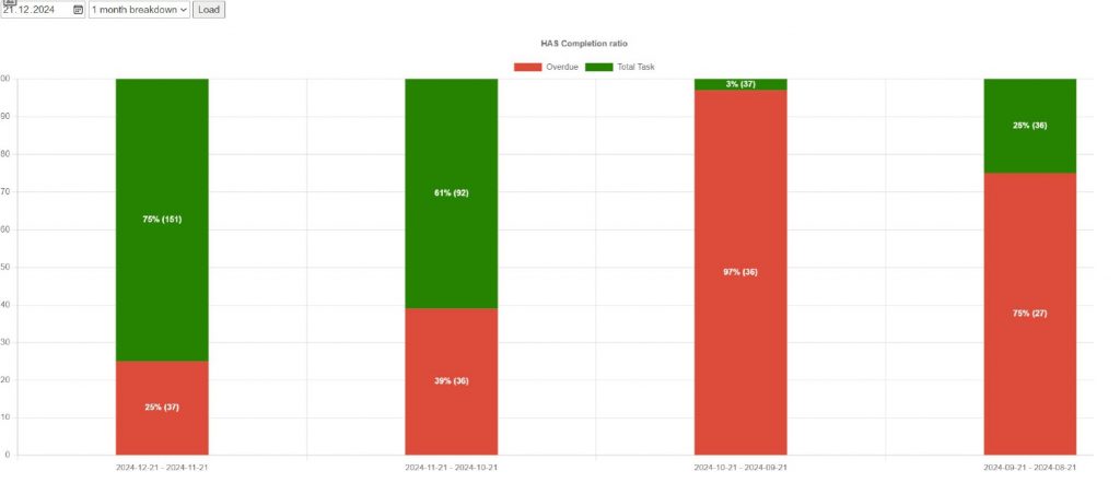 The Task Compliance ratios are automatically generated and displayed in each employee’s “Timeline.” They are available either as a point-in-time analysis of the current total and overdue tasks or as a time-frame analysis of overdue and total tasks within a specific review period. Compliance ratios can also be filtered by station and user. Detailed ratios are provided separately for trainings, announcements, documents, vehicles, irregularities, and light tasks.